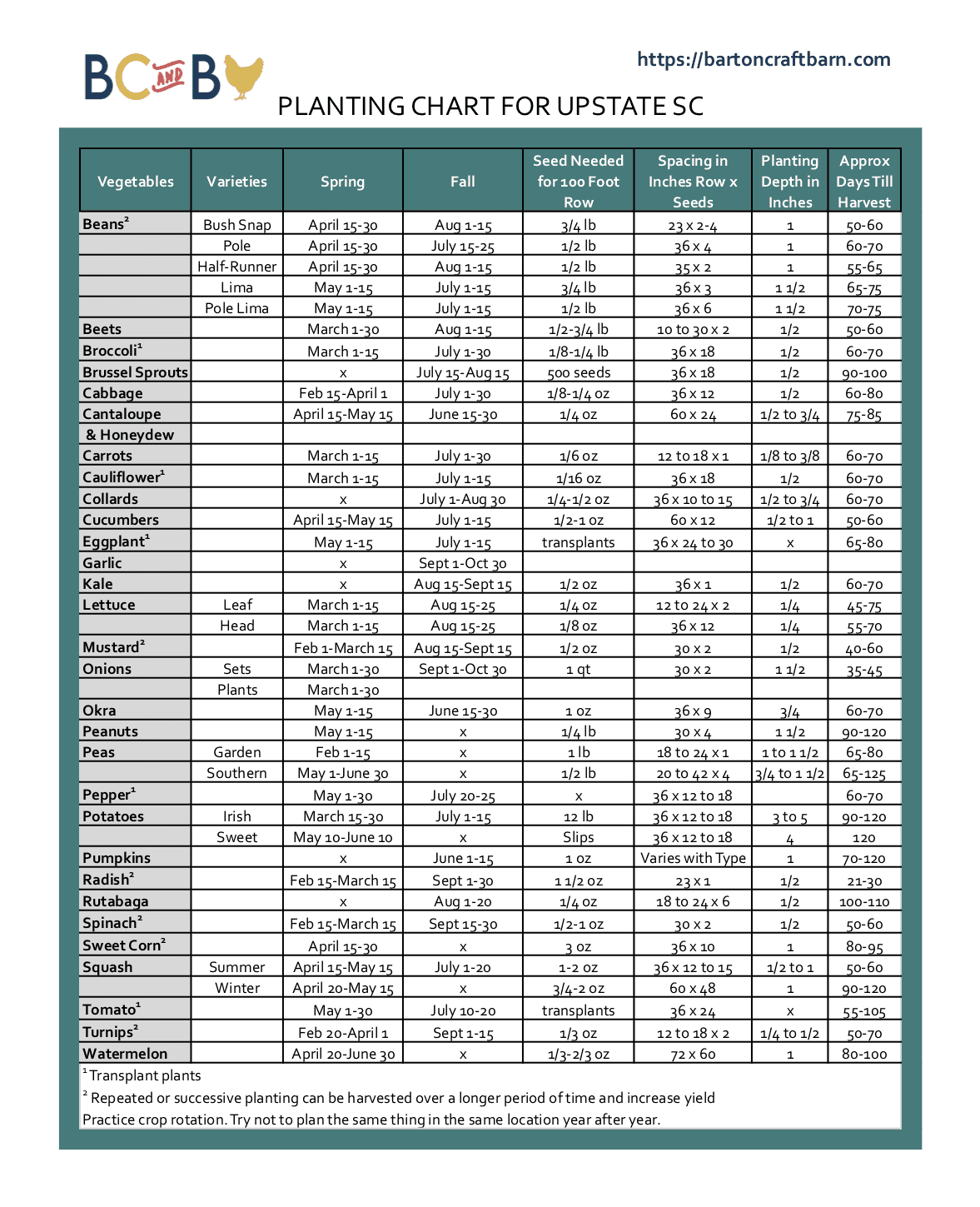 In general, we start our garden from seeds, with the exception of tomatoes and peppers. Usually we buy our plants and seeds at a local feed & seed store. Another great source for quality seeds online is the Vegetable Seed Warehouse. For the upstate of SC you can use the guide above in this section for the timing of when to plant your crops.
